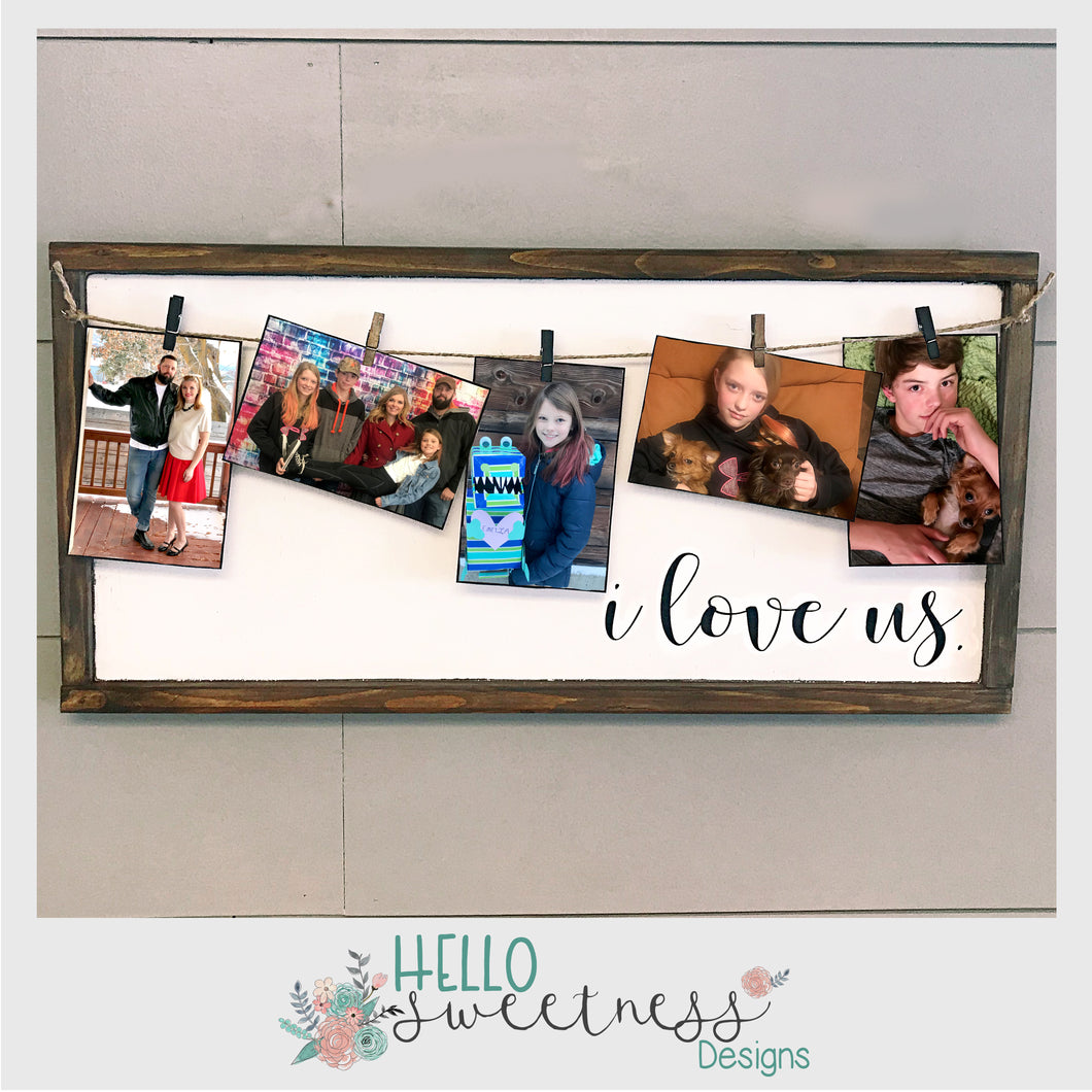 "I love us" photo board sign. What a fun and sweet way to display your family photos! You can choose between these 3 sayings (I love us, this is us, or Family). Have something else in mind? Specify in the comments the saying you'd like and I'll make it happen! Handcrafted in Plains, Montana.