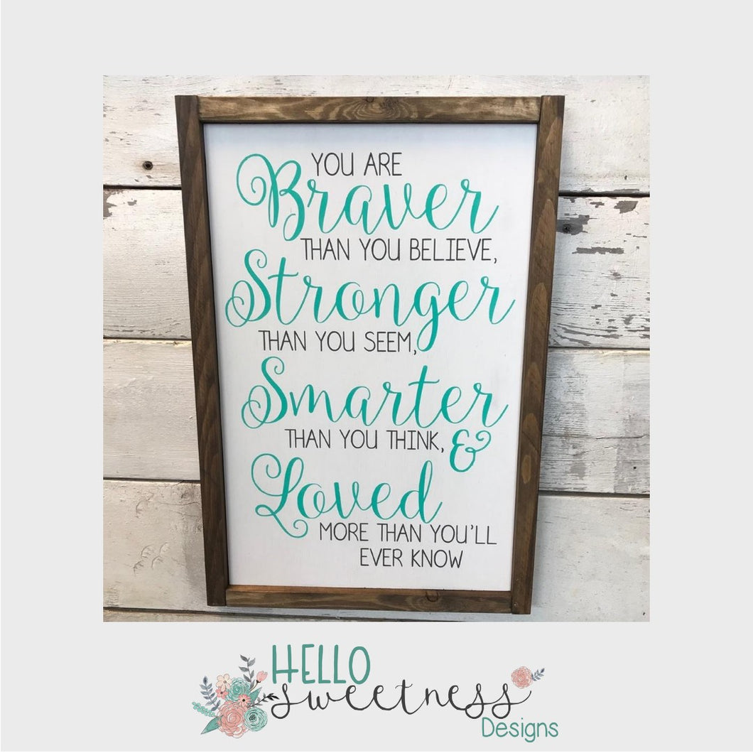 You are Braver than you believe, Stronger than you seem, Smarter than you think, and Loved more than you'll ever know! This sign is a great daily reminder. It will look good in any home, office, or even a kid's room!